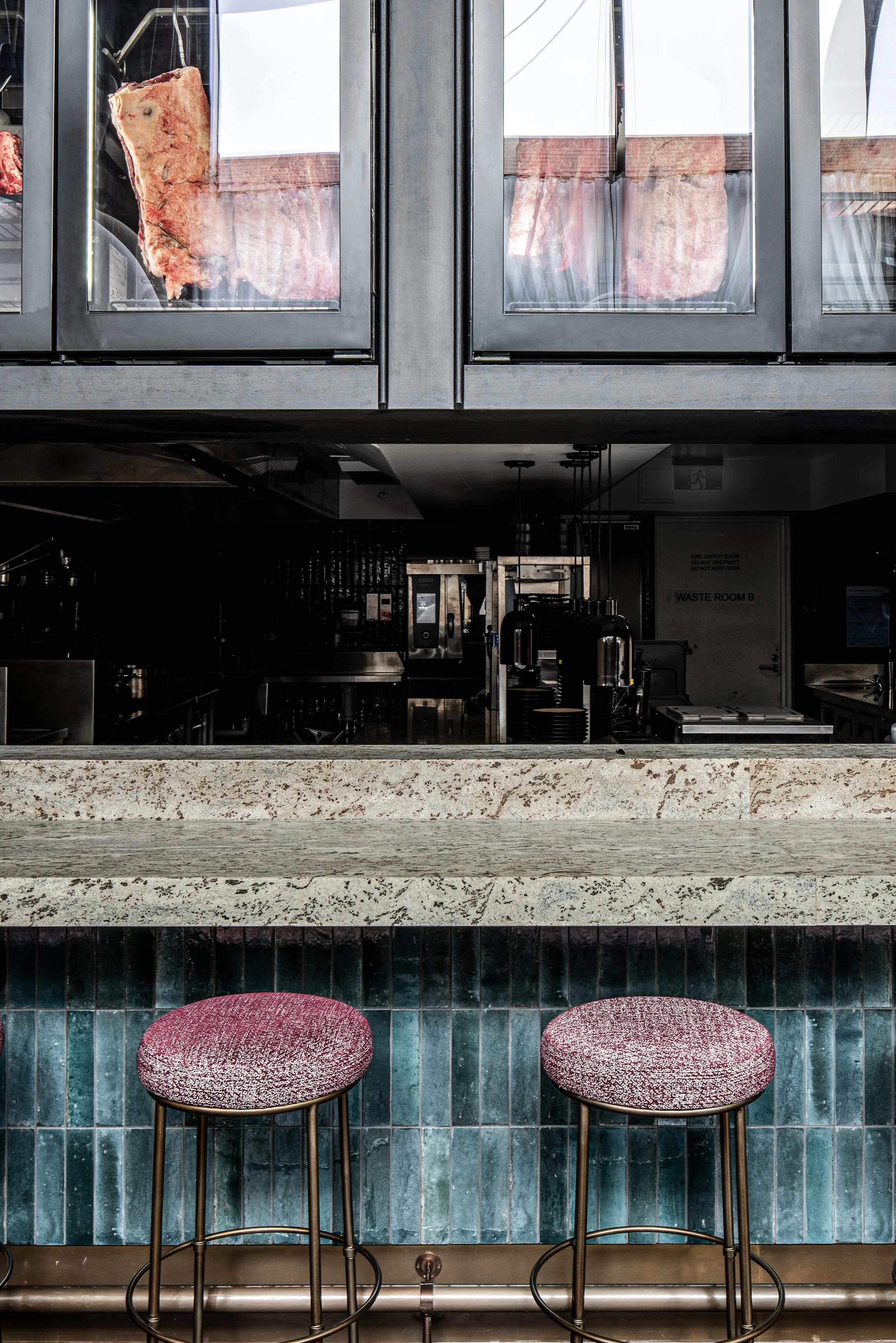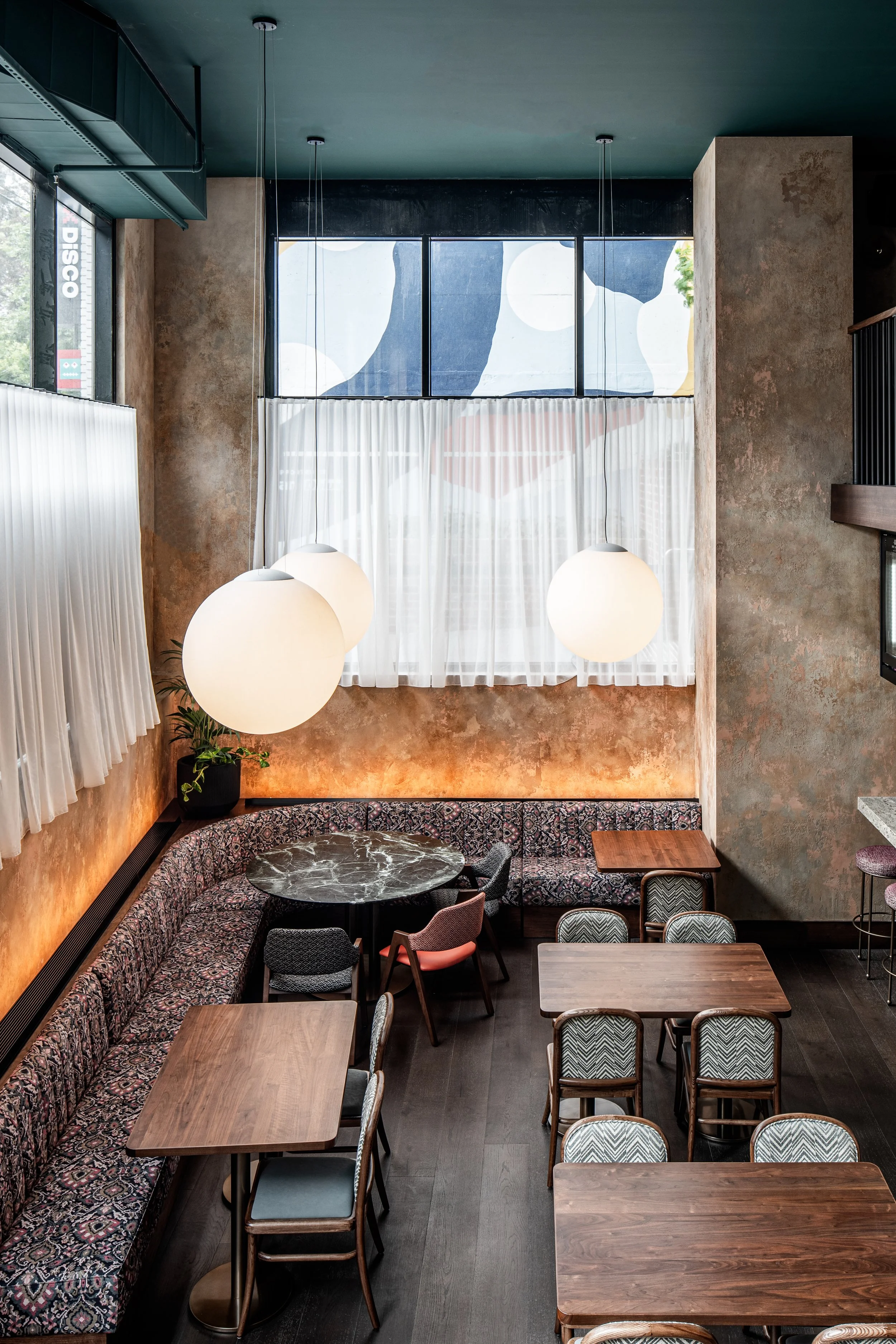 Featured are our patterned upholstered banquettes and striking marble top dining tables, working in harmony with the rendered wall finish to make this space truly captivating.